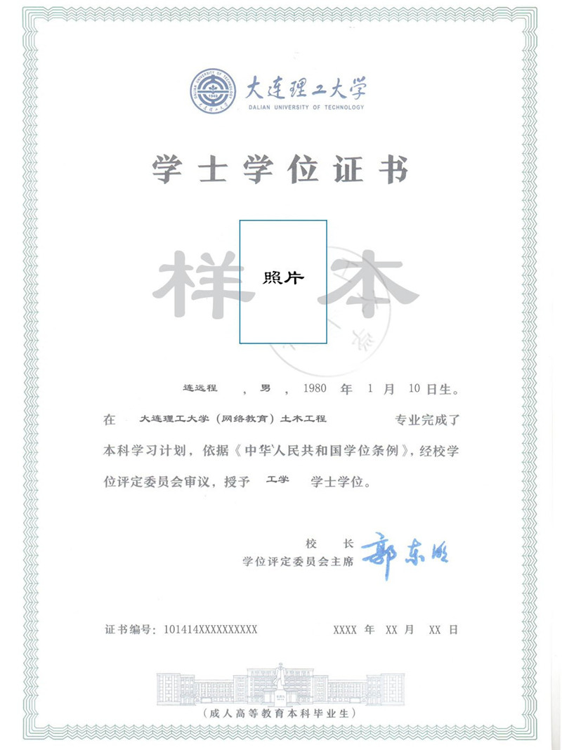 專科起點本科:凡在規(guī)定畢業(yè)期限內(nèi)修完本專業(yè)教學計劃規(guī)定的全部學分,并通過全國高校網(wǎng)絡(luò)教育考試委員會組織的《大學英語B》和《計算機應(yīng)用基礎(chǔ)》課程全國統(tǒng)考,可獲得加注網(wǎng)絡(luò)教育的大連理工大學本科畢業(yè)證書,教育部電子注冊(證書編號中辦學類型代碼為7),國家承認學歷。達到學士學位授予條件者,由學生本人申請,經(jīng)學院學位評定分委員會審核及校學士學位評定委員會討論通過后,可獲得加注網(wǎng)絡(luò)教育的大連理工大學******高等教育本科畢業(yè)生學士學位證書。